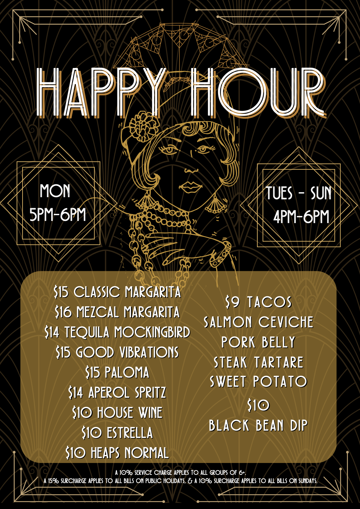 From 5-6pm on Monday, and 4-6pm, Tuesday to Sunday, you can sit back, relax and enjoy cocktails from $14 as well as a host of other drinks specials you can see below. Elevate your experience by pairing these delicious drinks with our most popular tacos for just $9 each, featuring delights like Salmon Ceviche, Pork Belly, Steak Tartare, and Sweet Potato.